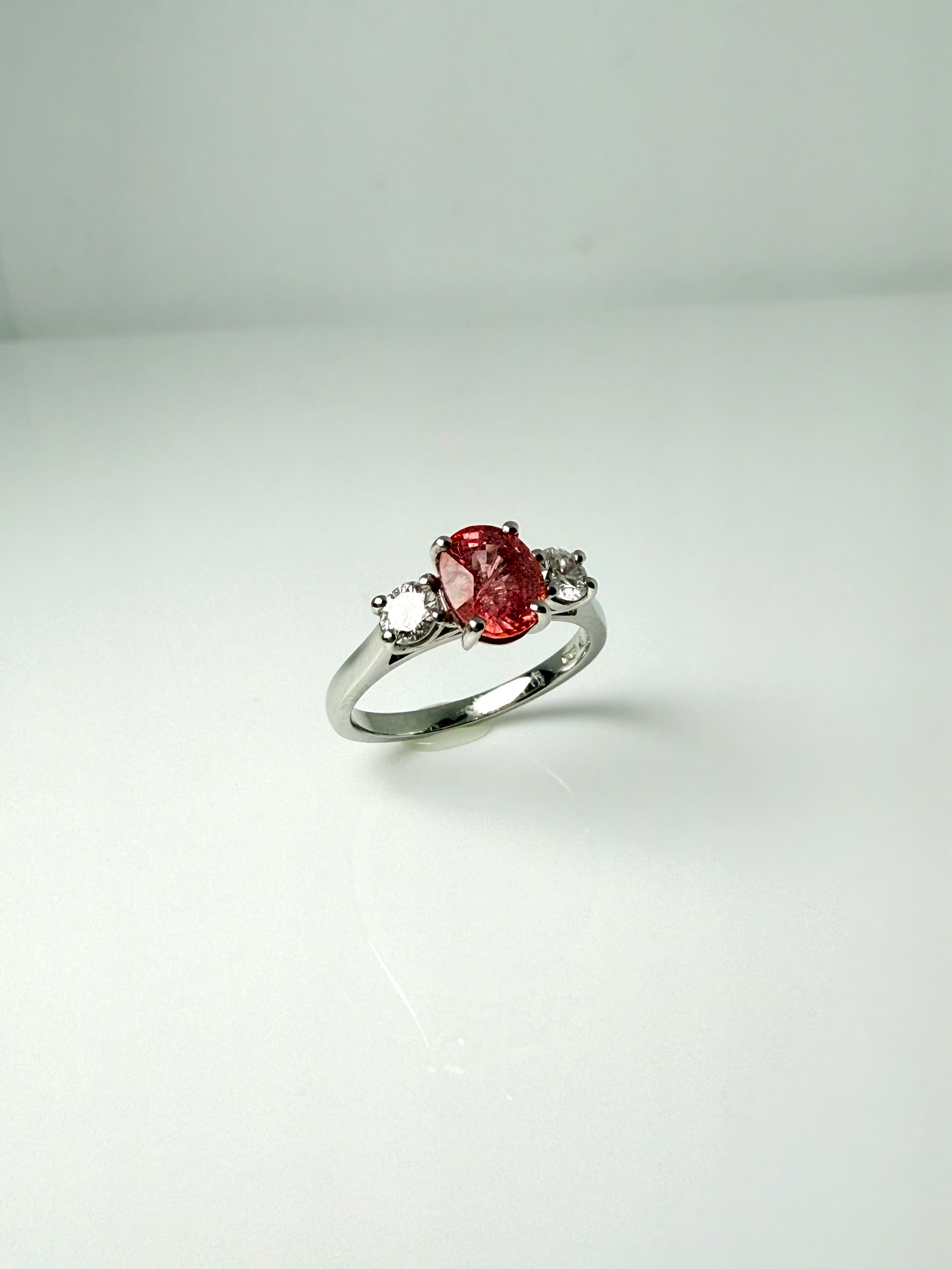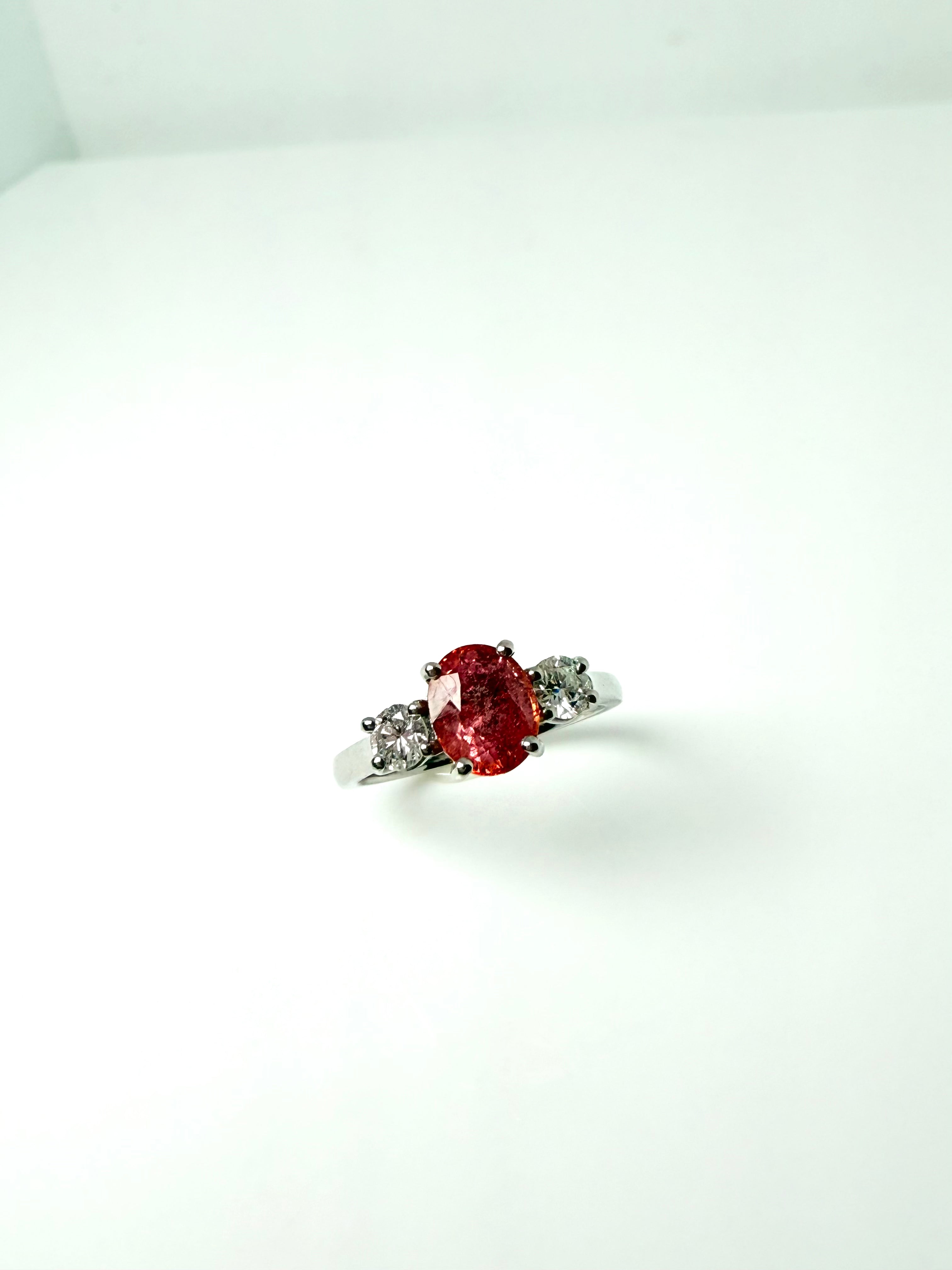 PLATINUM TRILOGY RING MADE UP OF A OVAL PADPARADSCHA SAPPHIRE AND 2 DIAMONDS