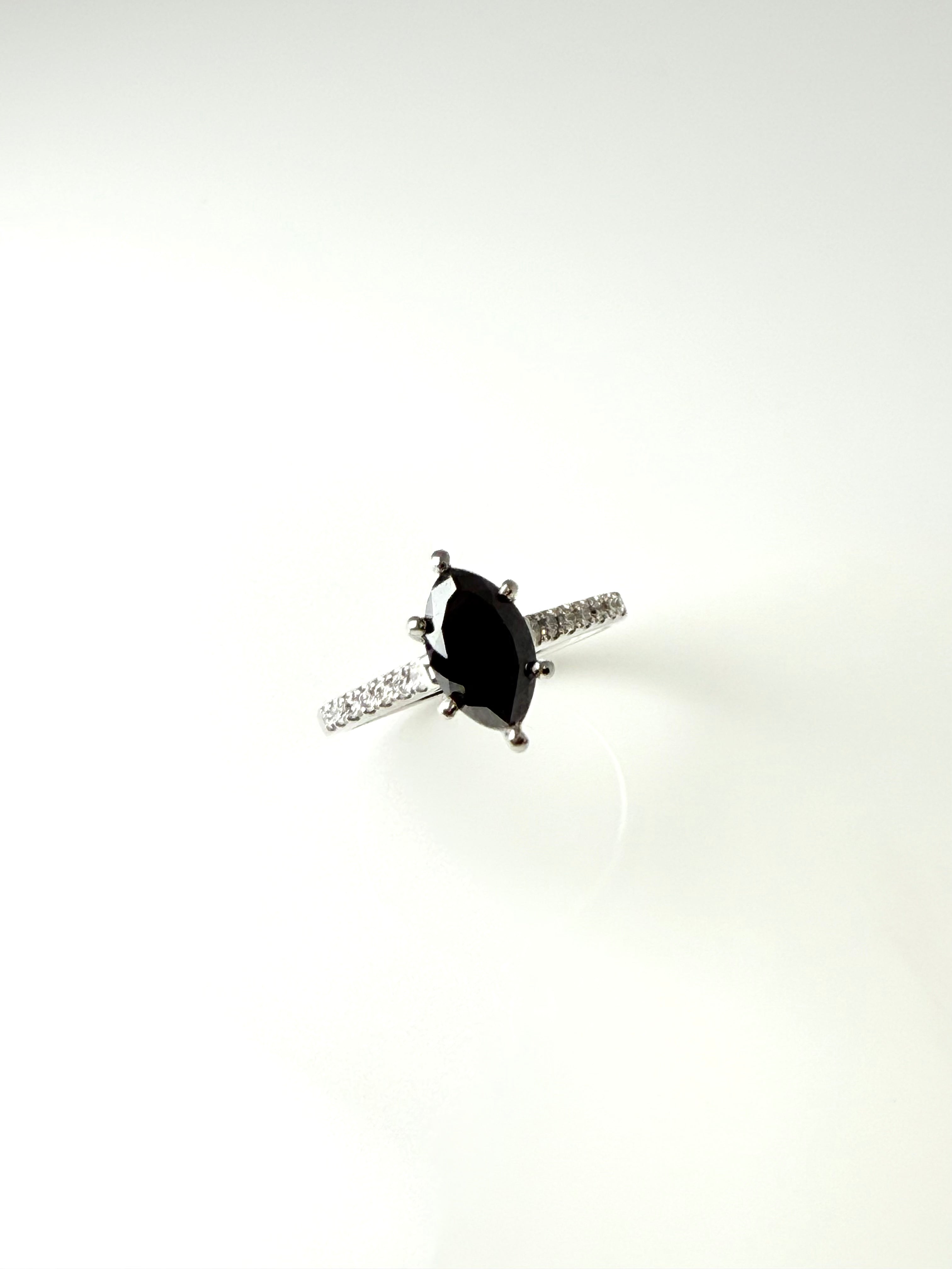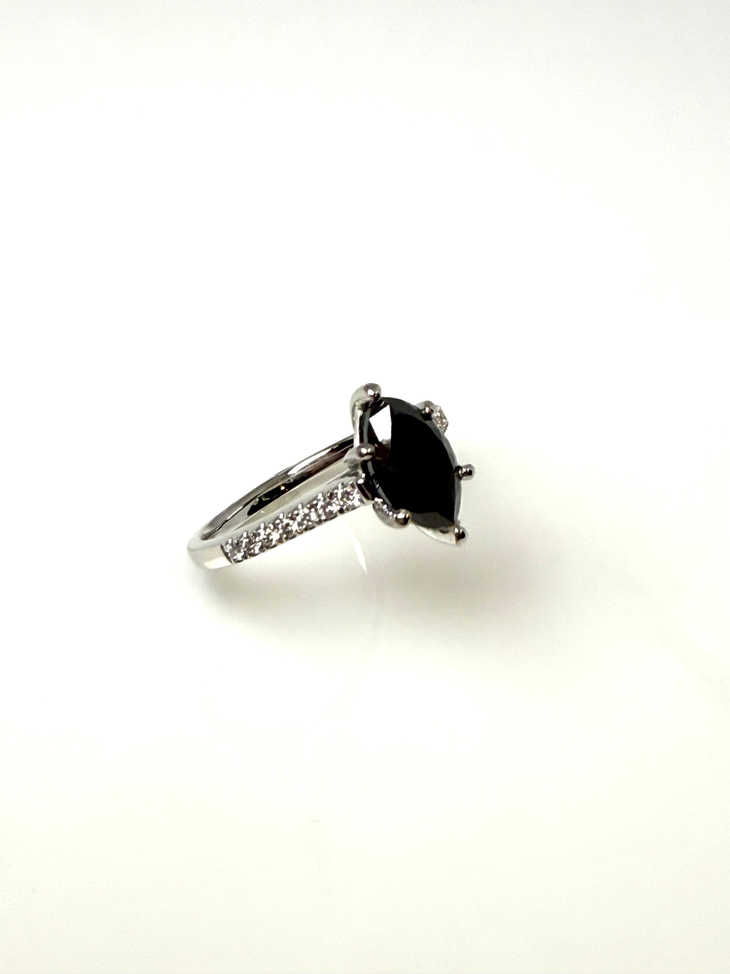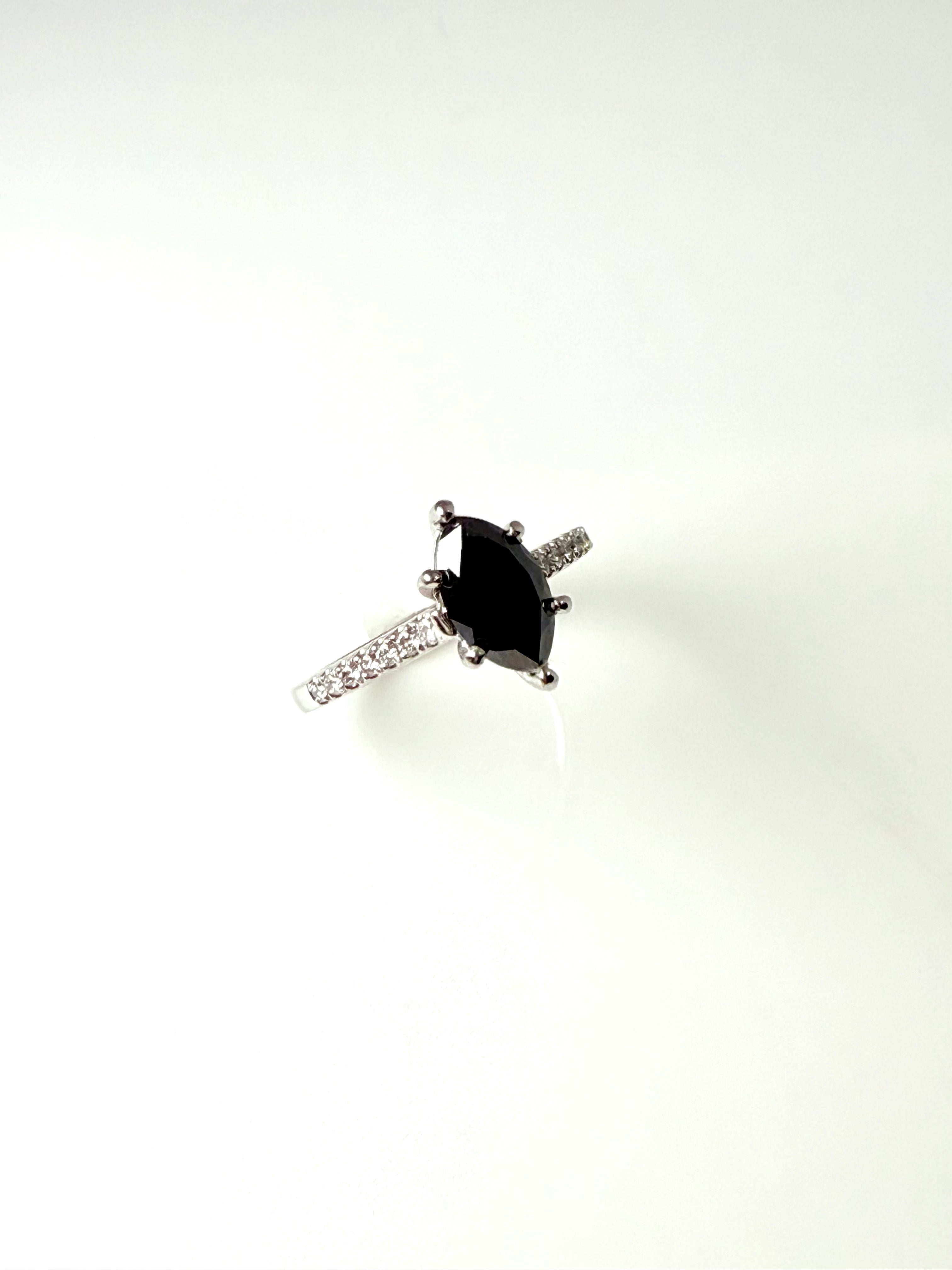 PLATINUM BAND WITH A MARQUISE CUT BLACK DIAMONDS, WITH WHITE DIAMOND SHOULDERS.