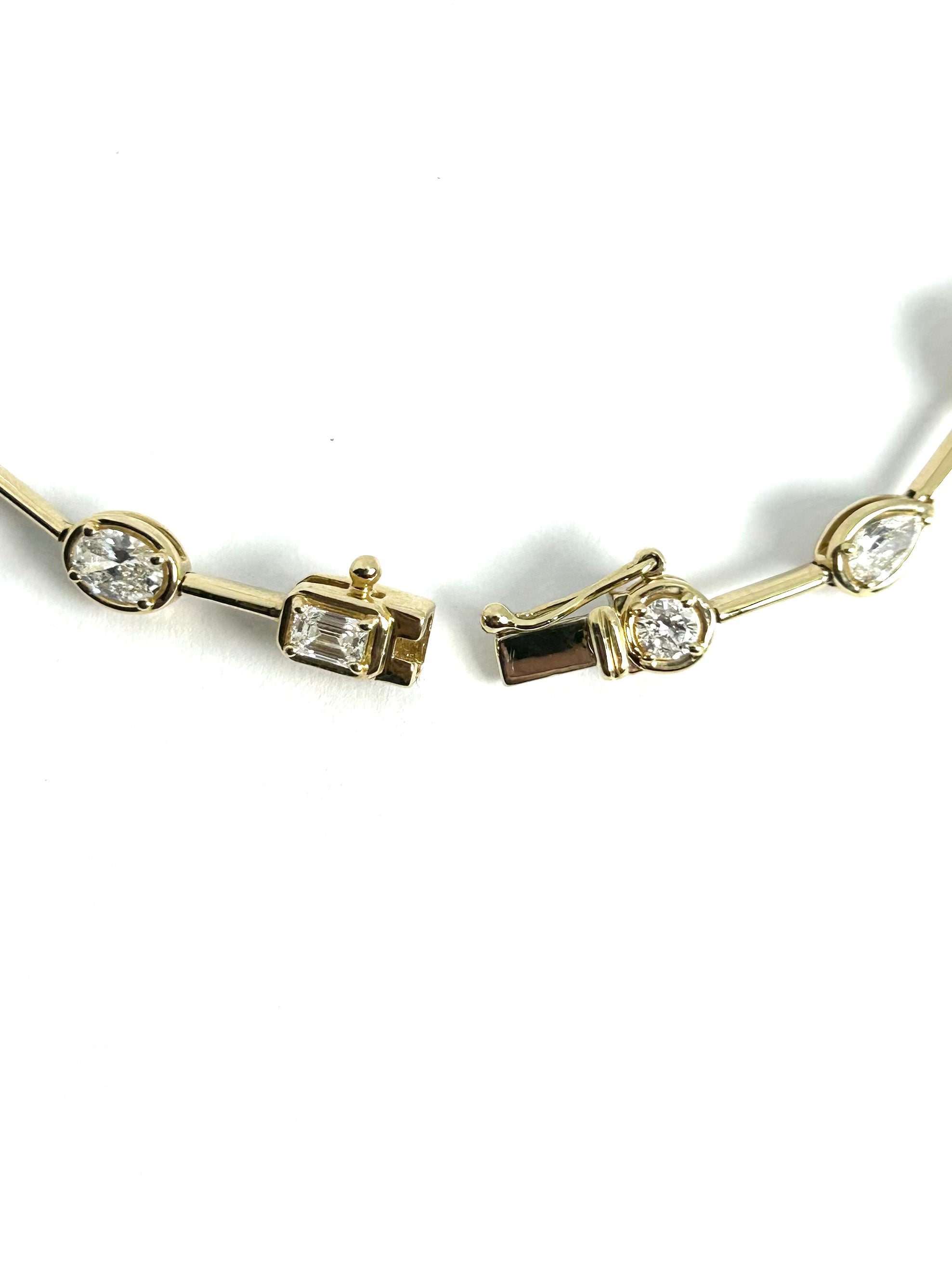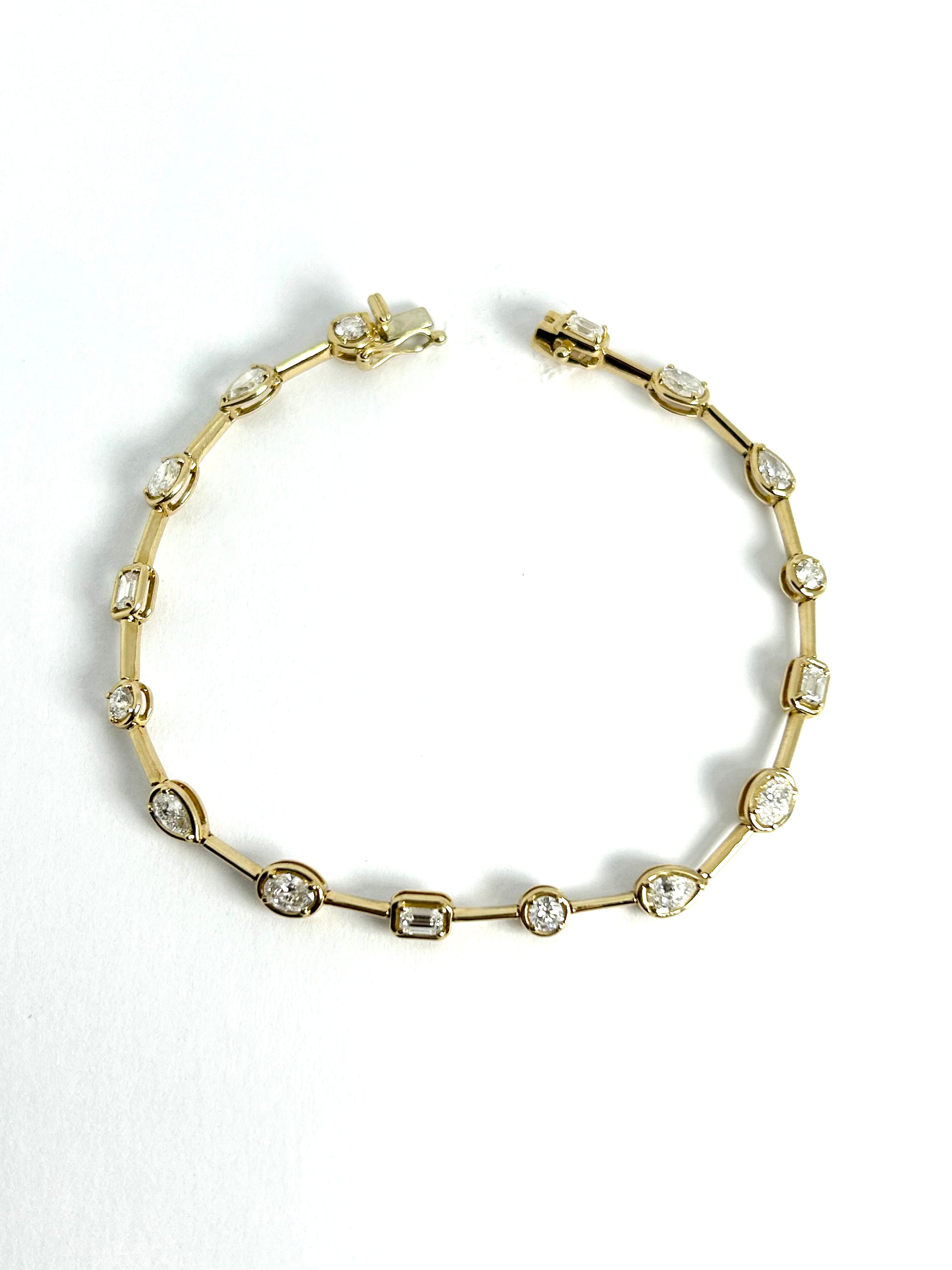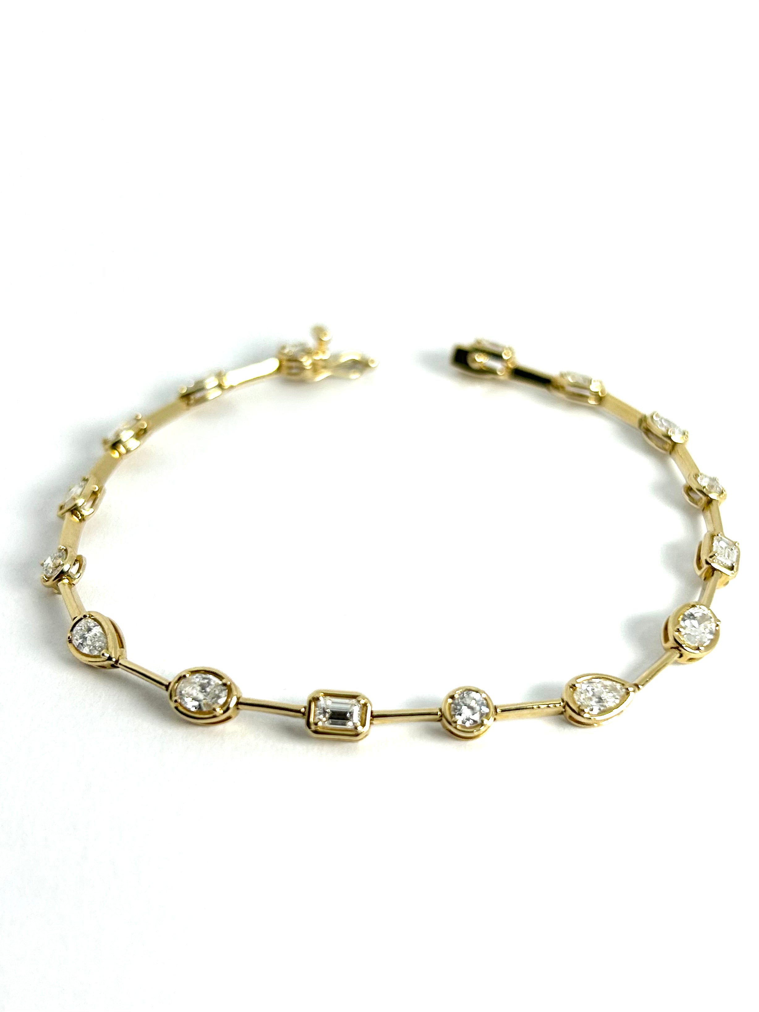 THIS BRACELET IS MADE IN 14CT YELLOW GOLD, WITH BEZEL SET LAB GROWN MIXED CUT DIAMONDS. TOTAL WEIGHT 2.09CT