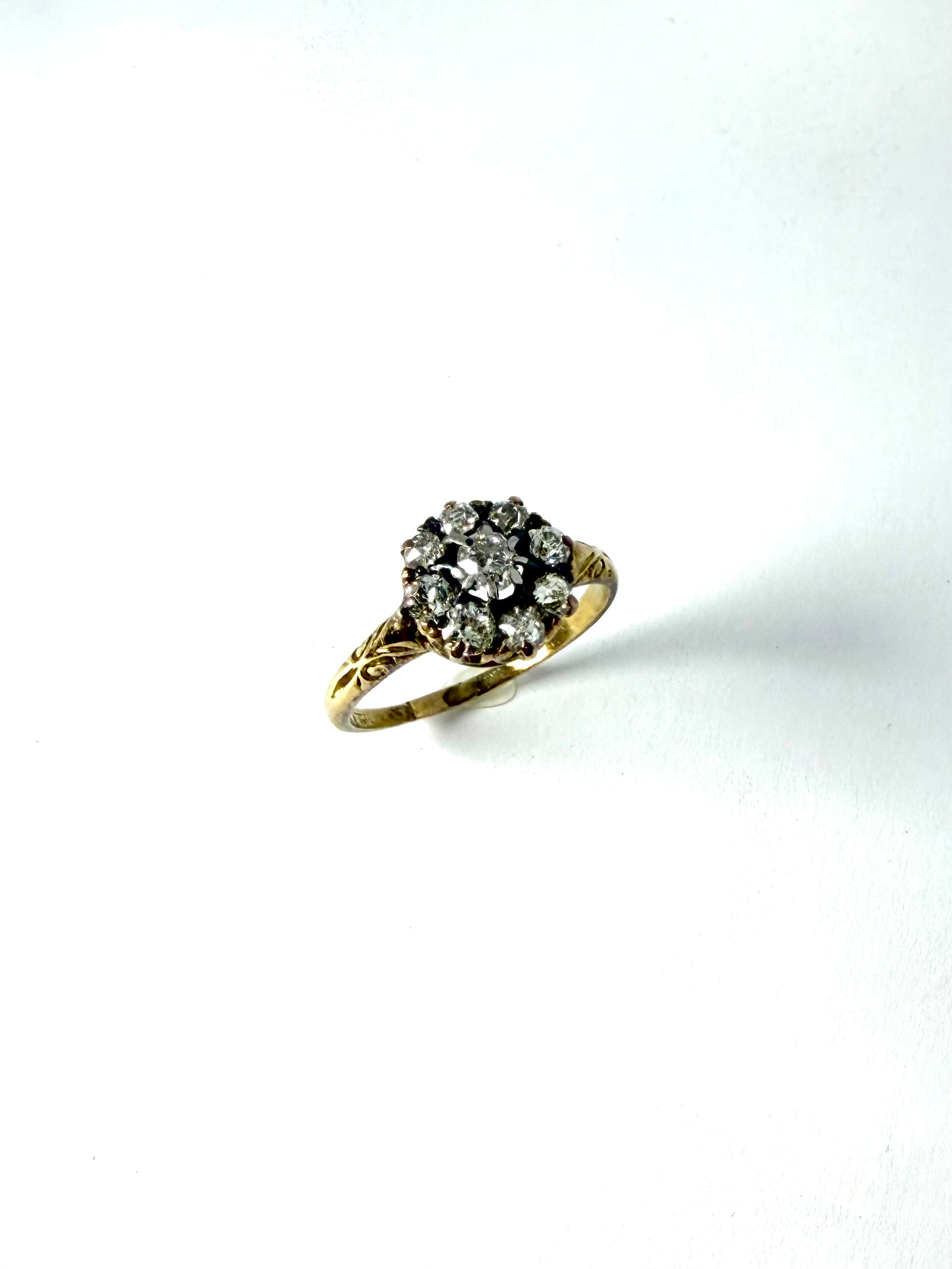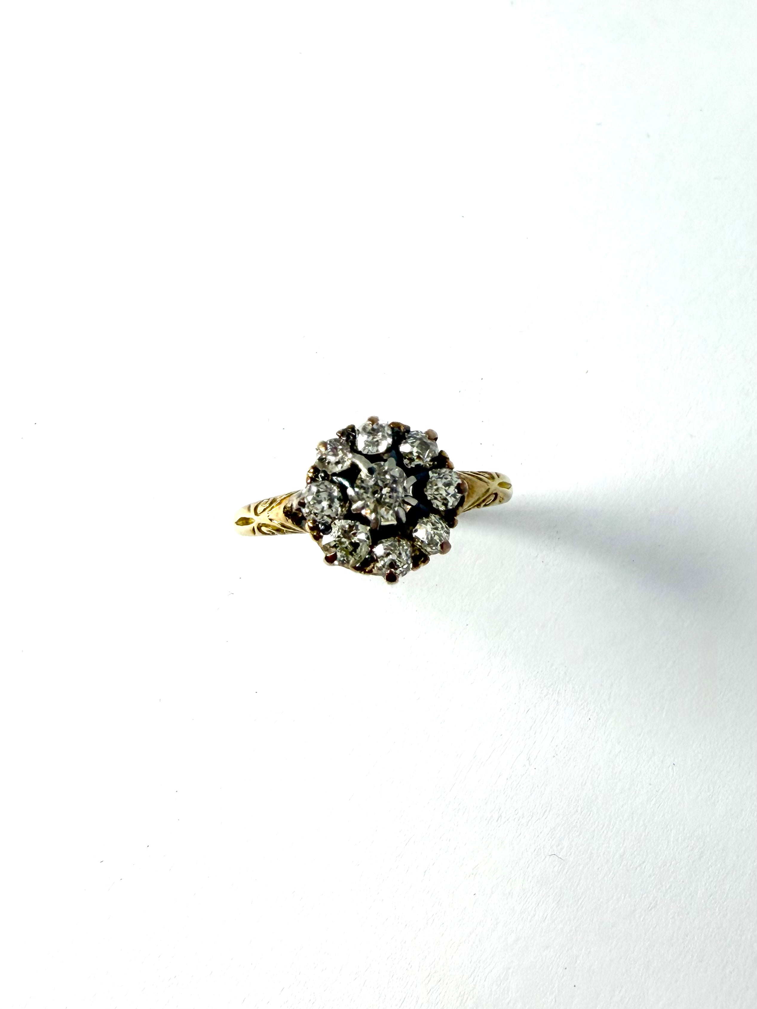A LOVELY VICTORIAN PRE LOVED DIAMOND DAISY CLUSTER RING SET IN 18CT YELLOW GOLD AND PLATINUM