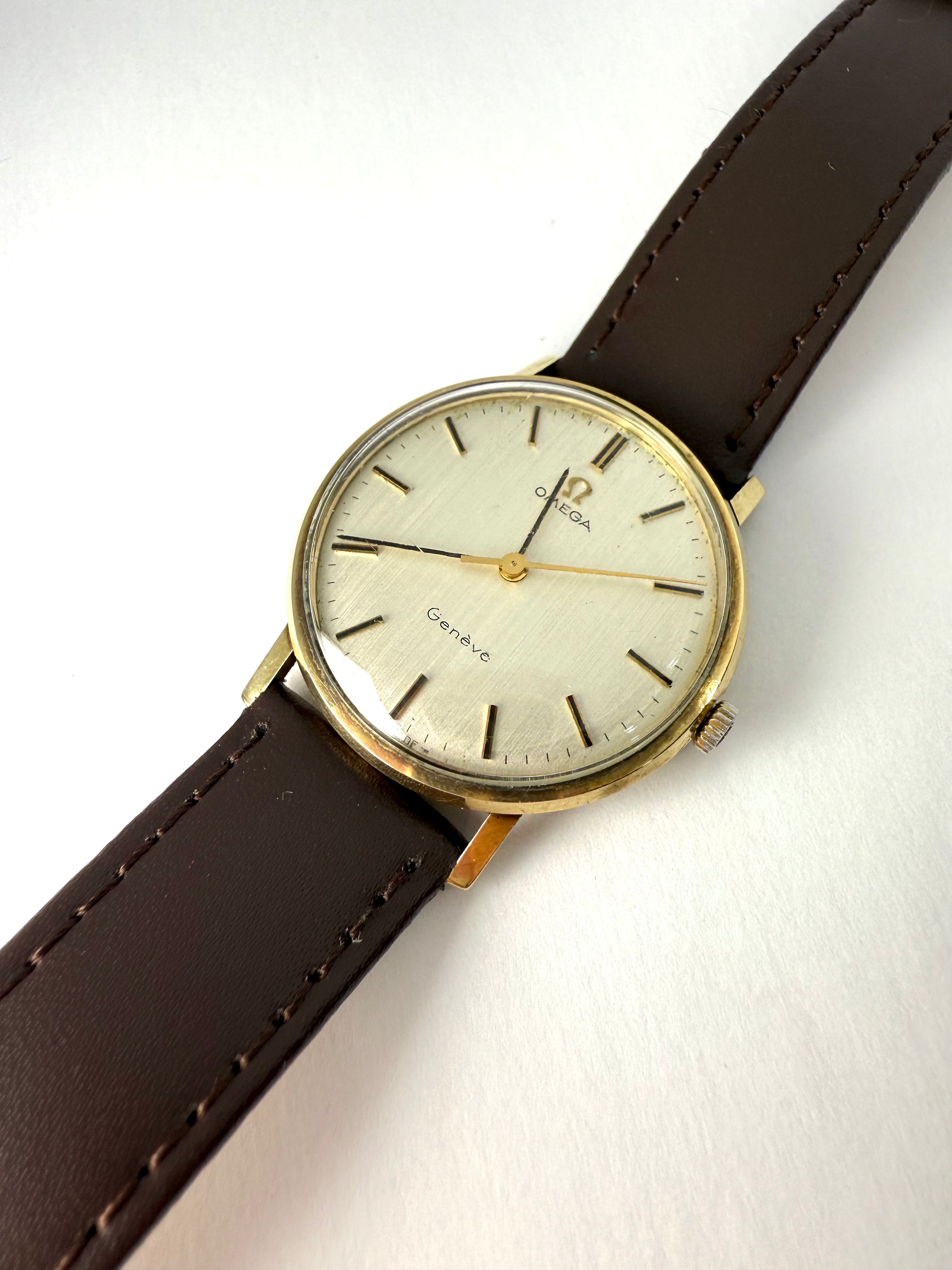 9CT YELLOW GOLD WITH A NEW BROWN LEATHER STRAP
