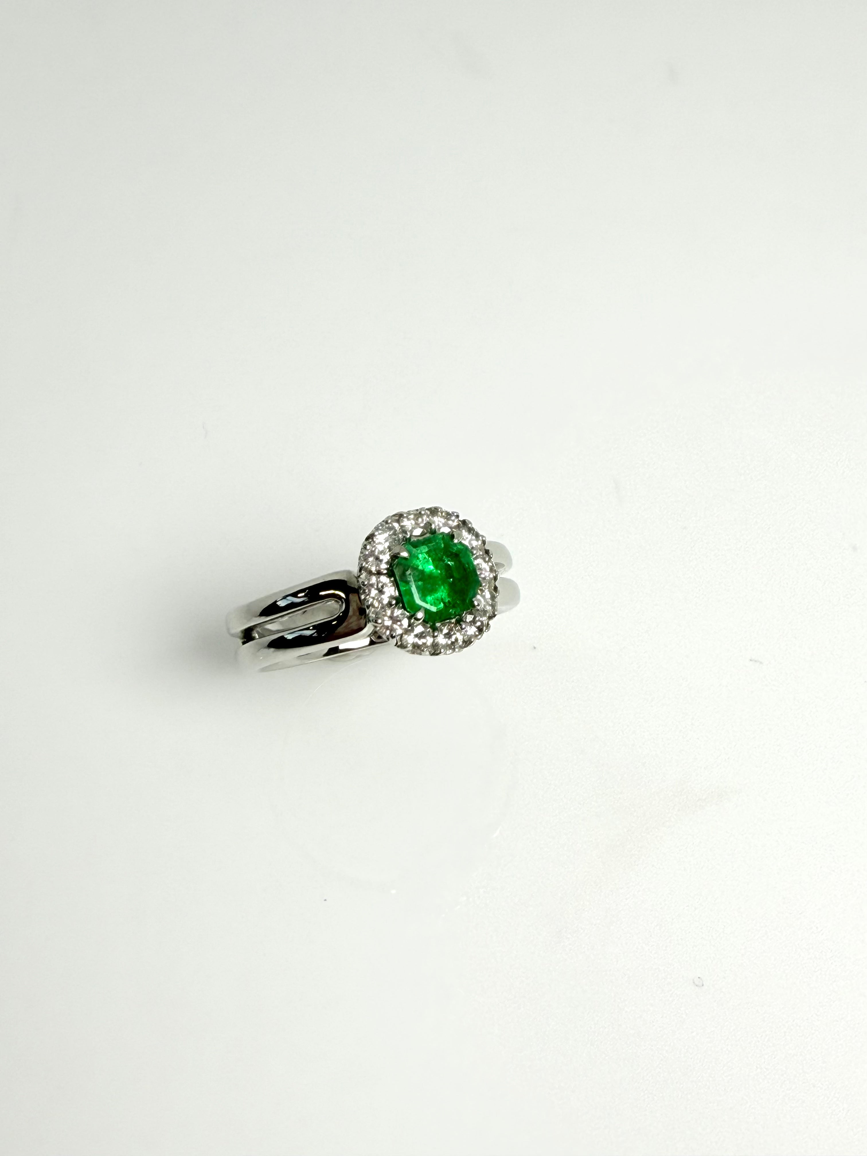 HEAVY PLATINUM SPLIT SHANK WITH A EMERALD DIAMOND HALO