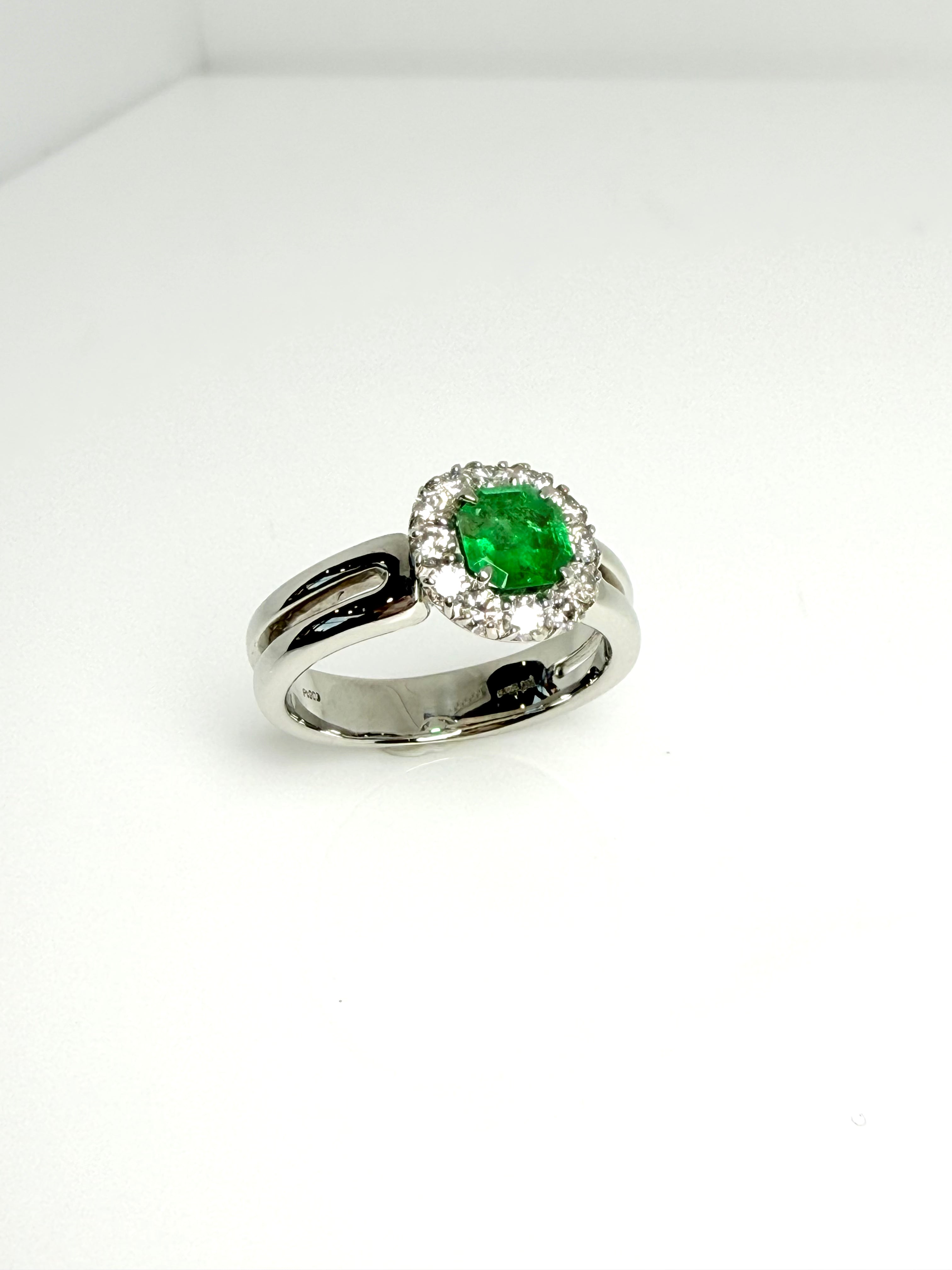 WIDE BAND PLATINUM SPIT SHANK WITH A 70PT EMERALD CENTRE AND DIAMOND HALO