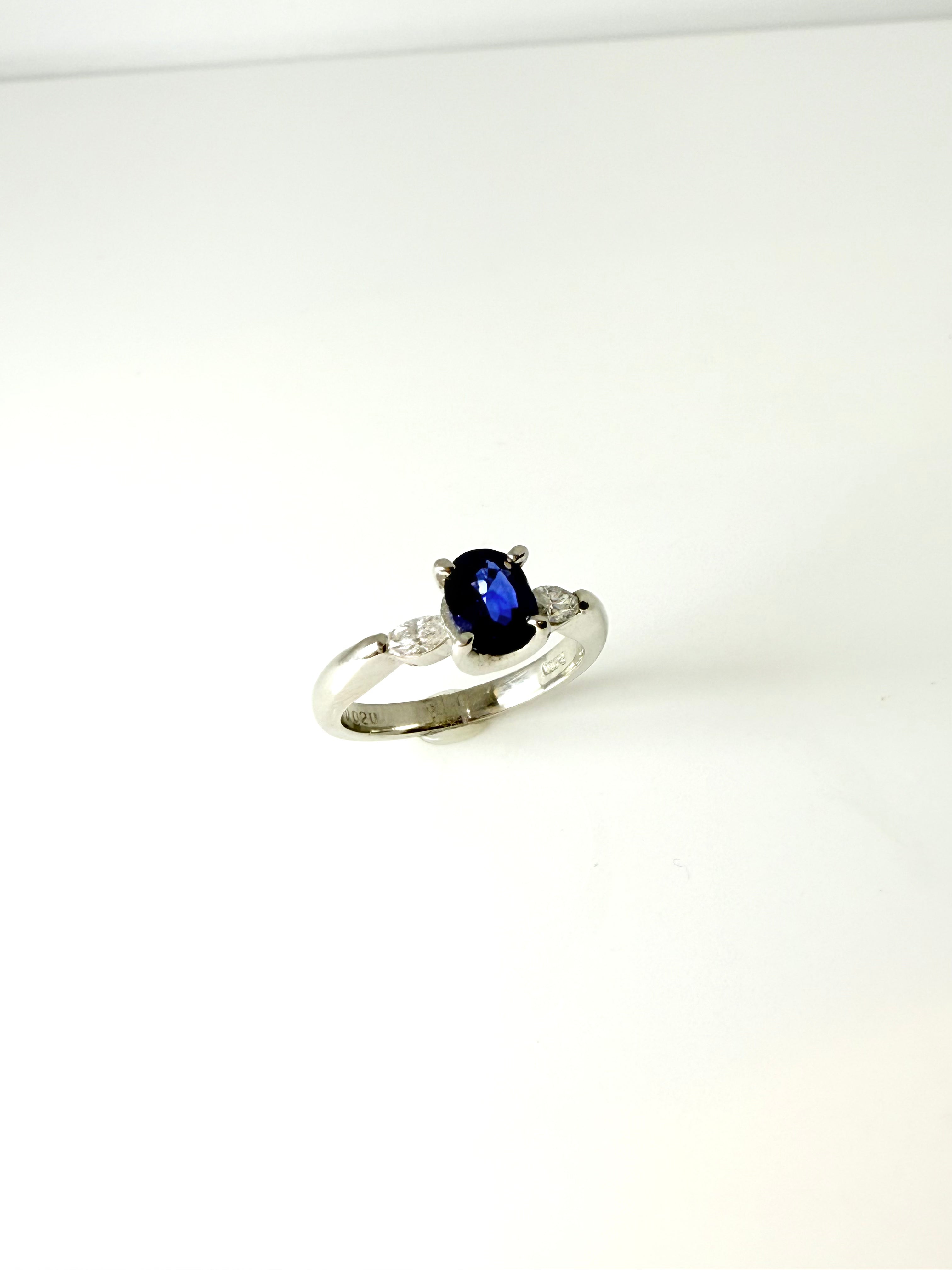 PLATINUM TRILOGY RING WITH AN OVAL 1.07CT BLUE SAPPHIRE WITH 20PT DIAMOND SHOULDERS