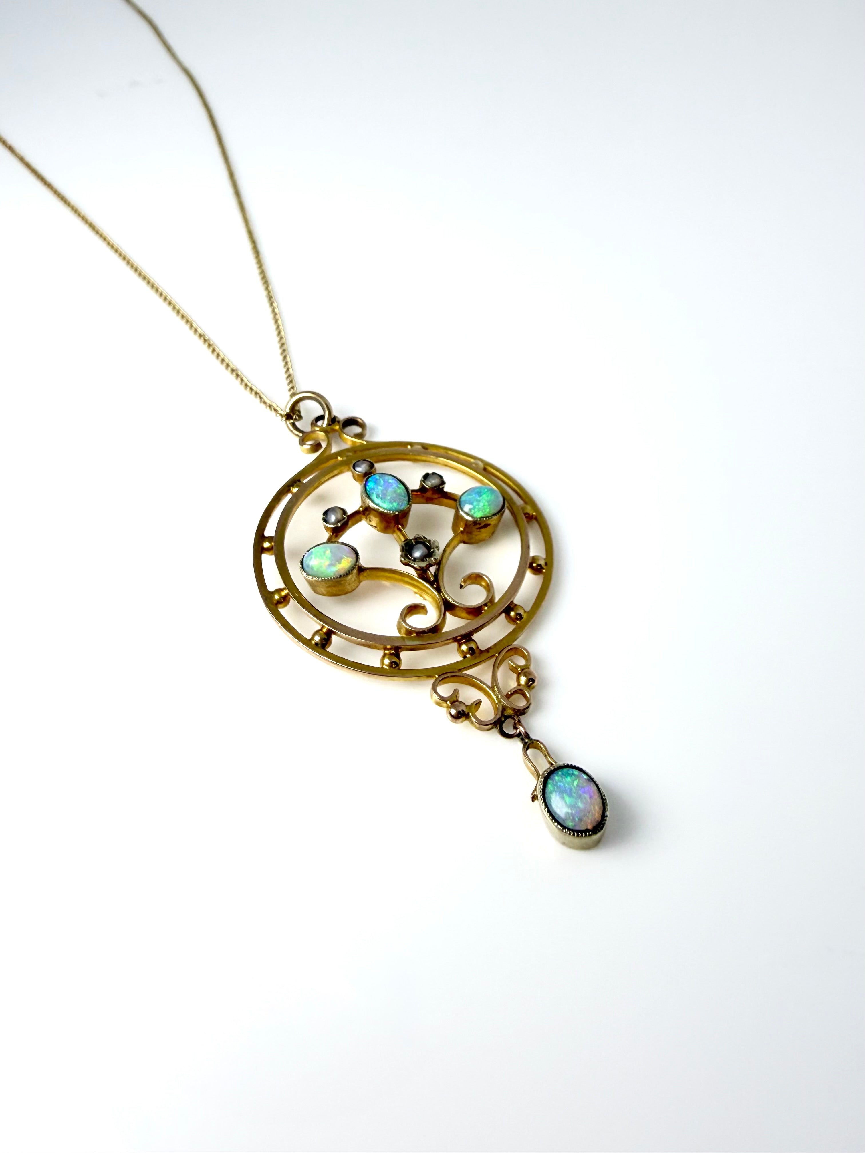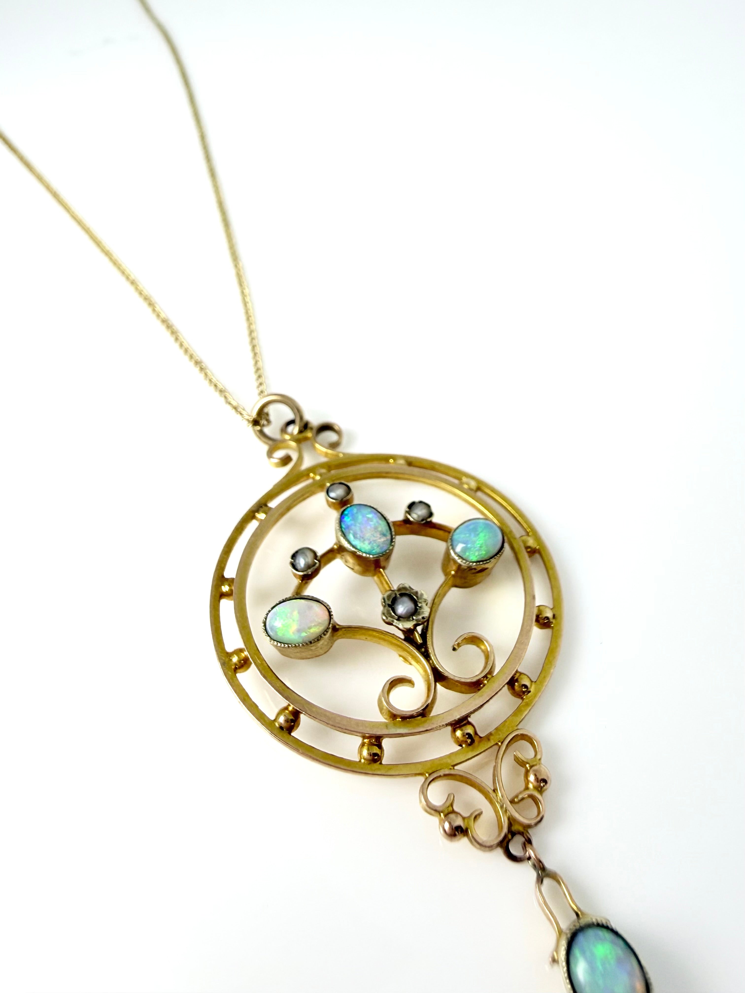 A VINTAGE PENDANT WITH OPALS AND SEED PEARLS SET IN 9CT YELLOW GOLD