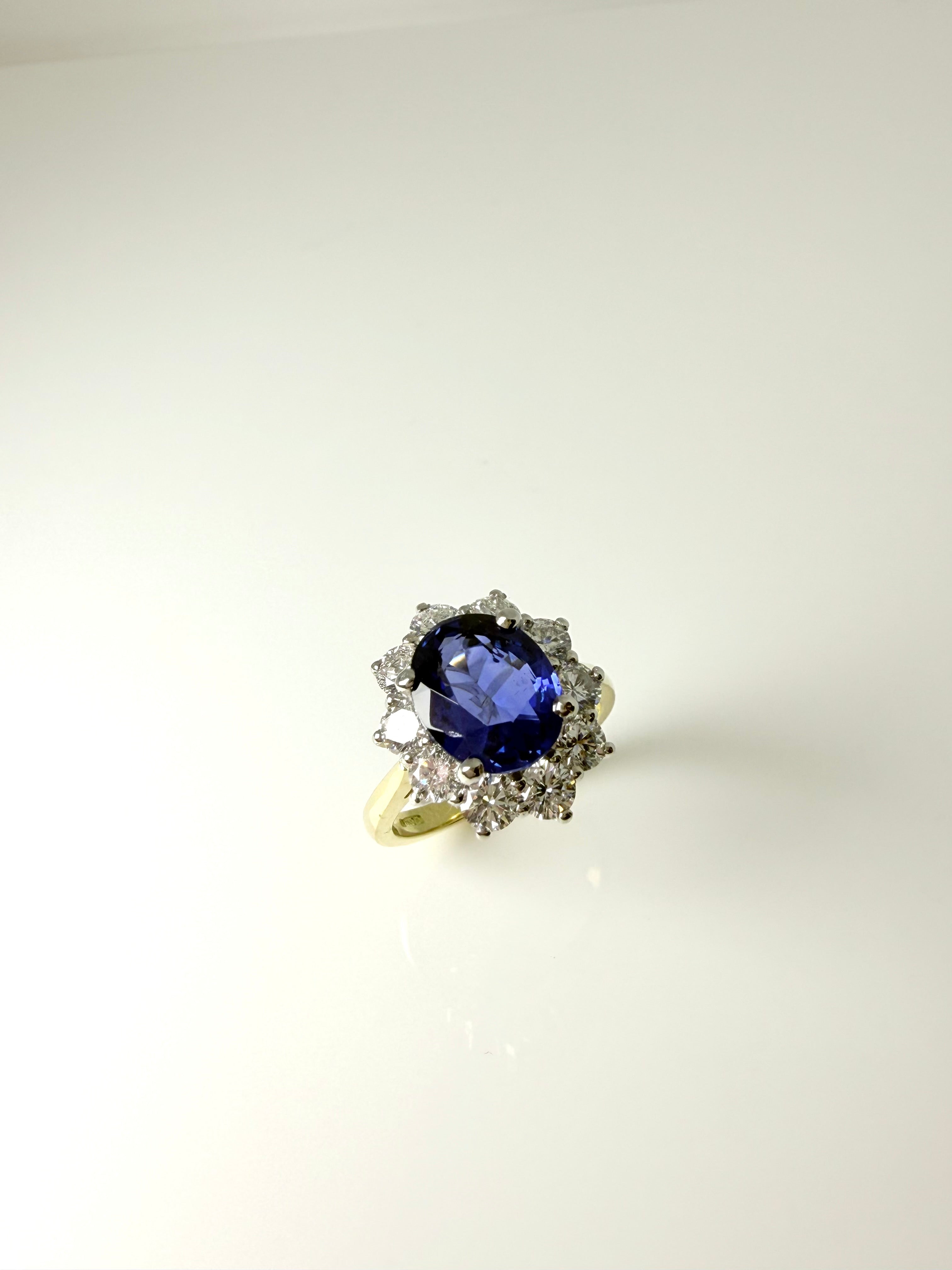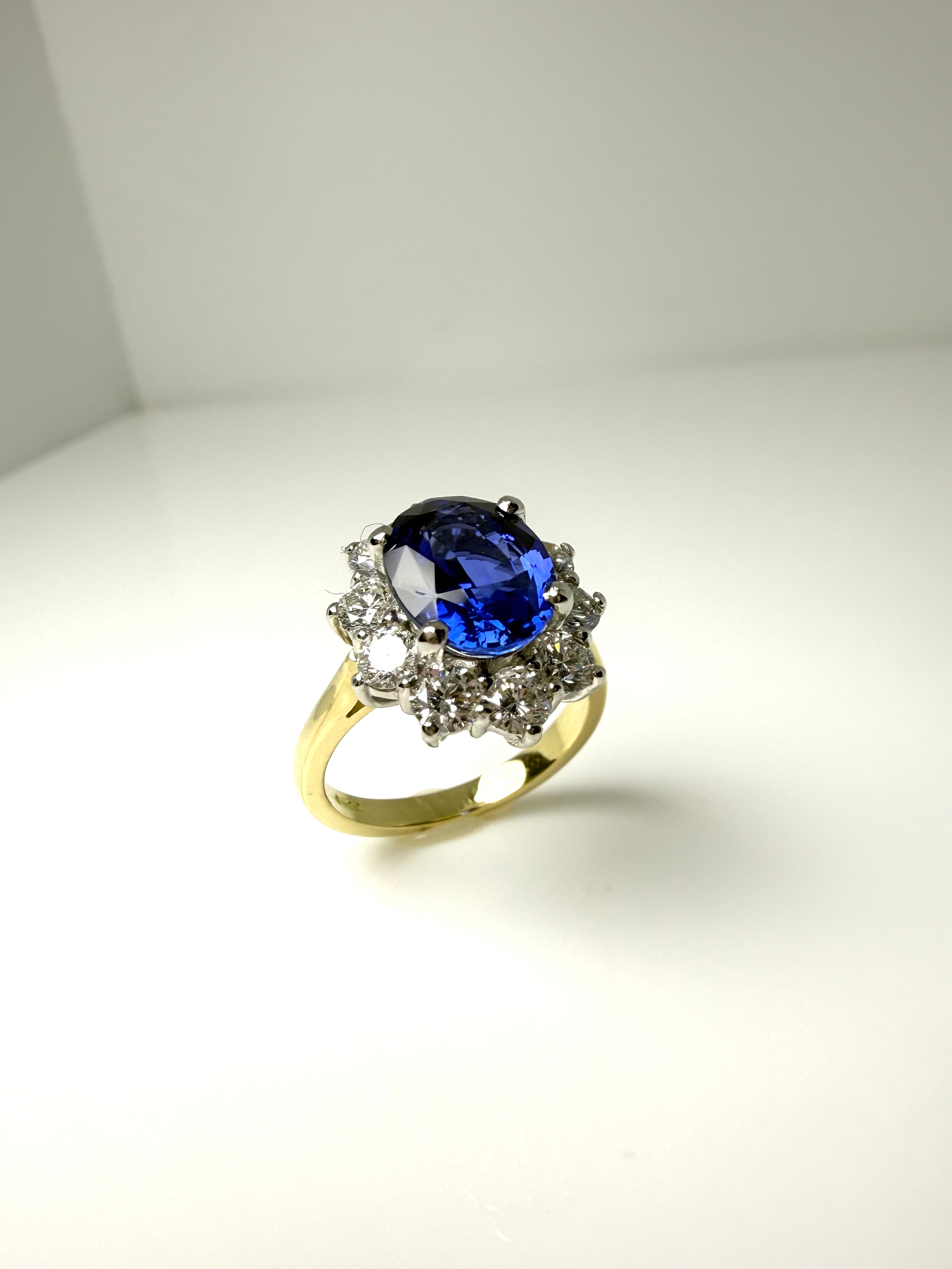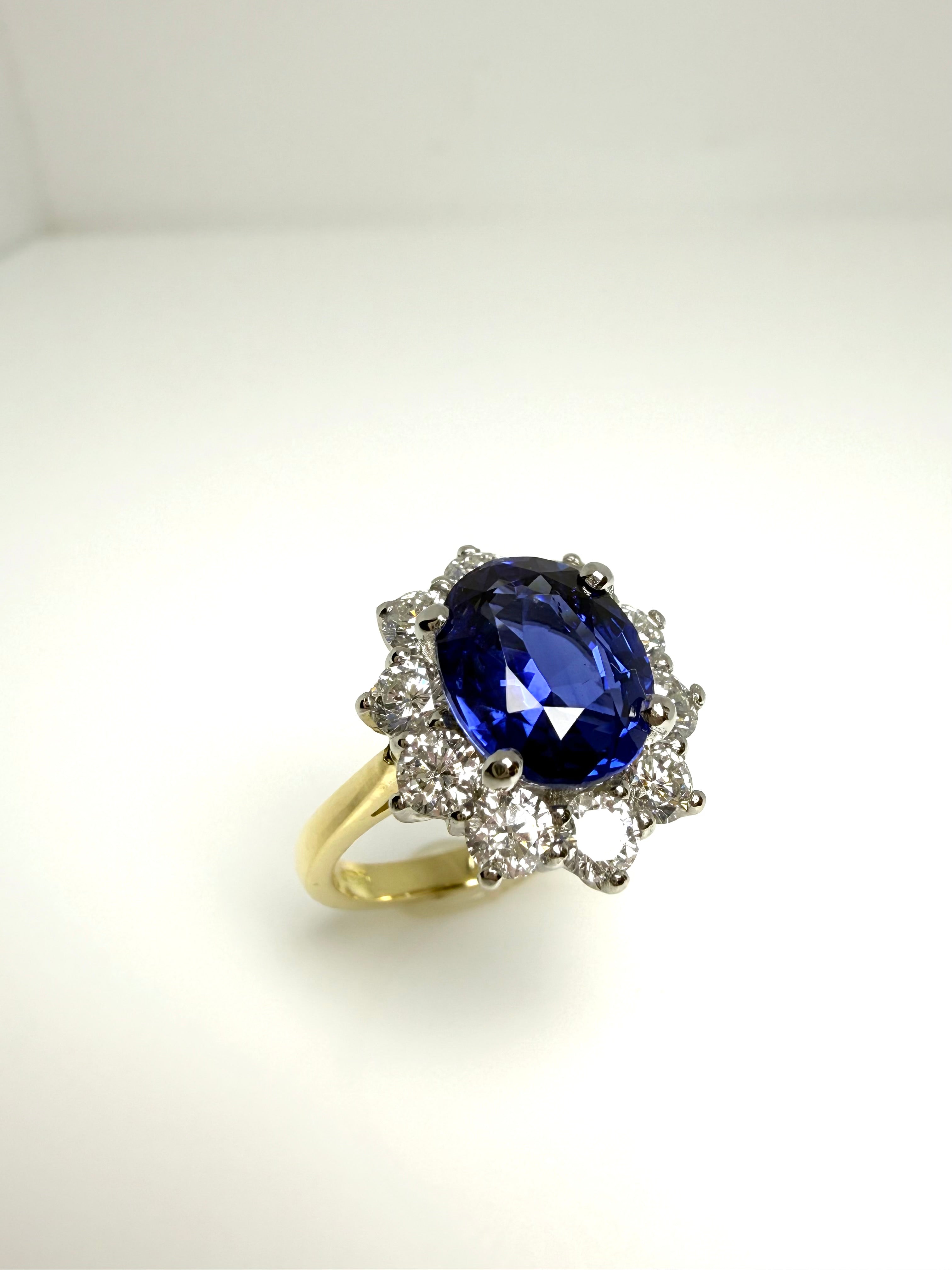 ROYAL BLUE SRI LANKAN OVAL SAPPHIRE CENTRE WITH 10 BRIGHT WHITE DIAMONDS CREATING THE CLUSTER.