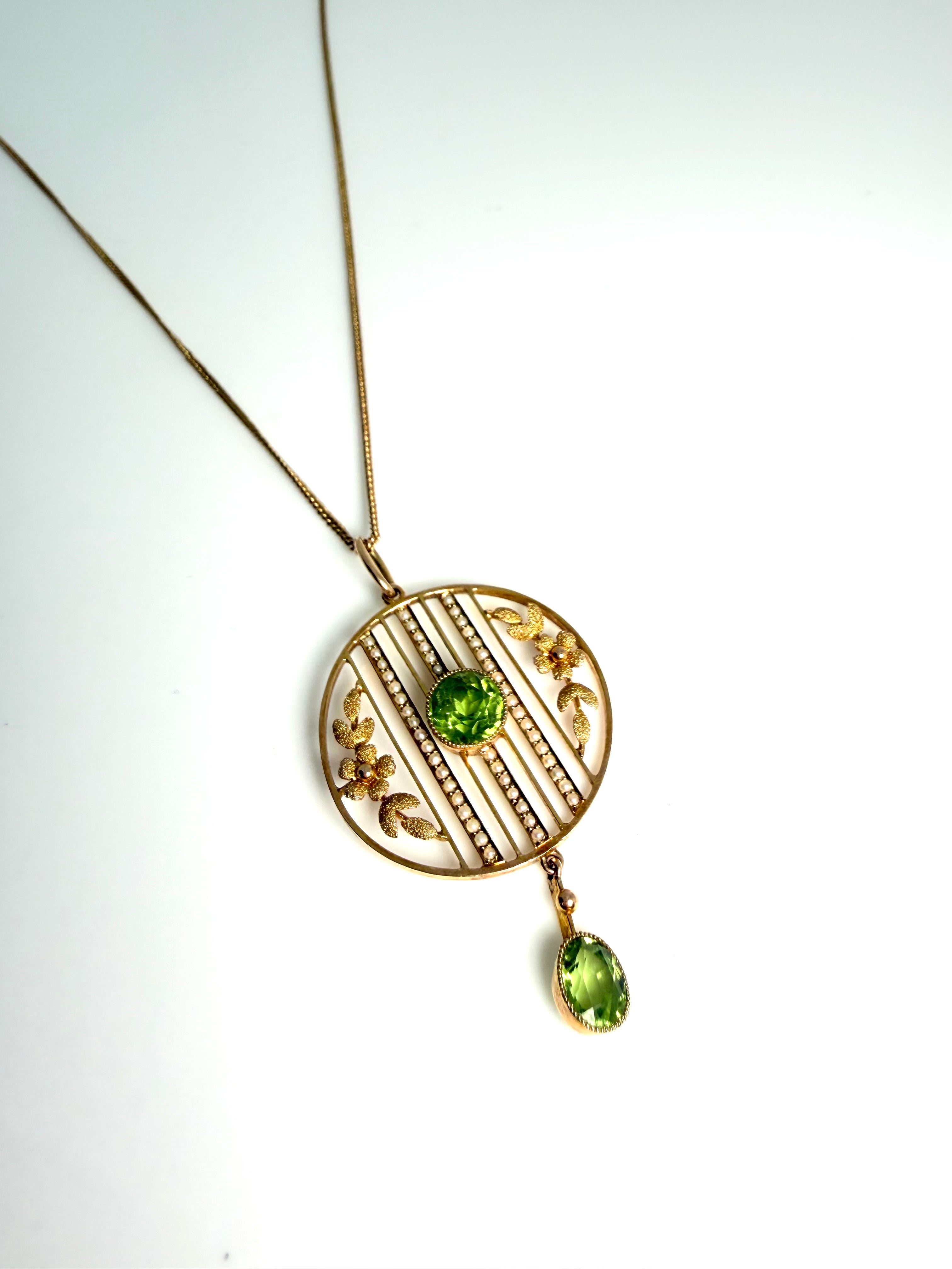 BEAUTIFULLY MADE 15CT YELLOW GOLD PENDANT WITH SEED PEARL AND PERIDOT