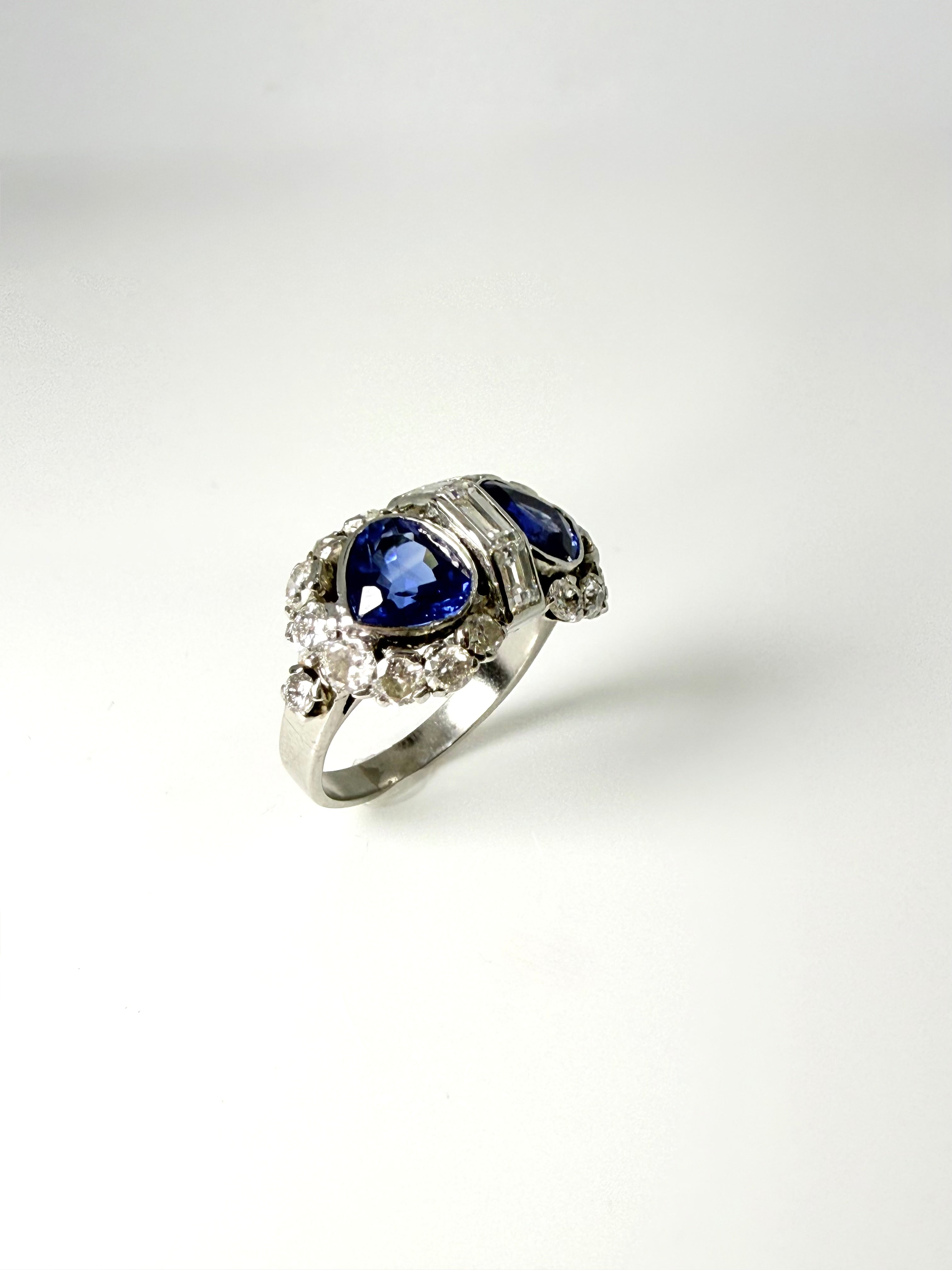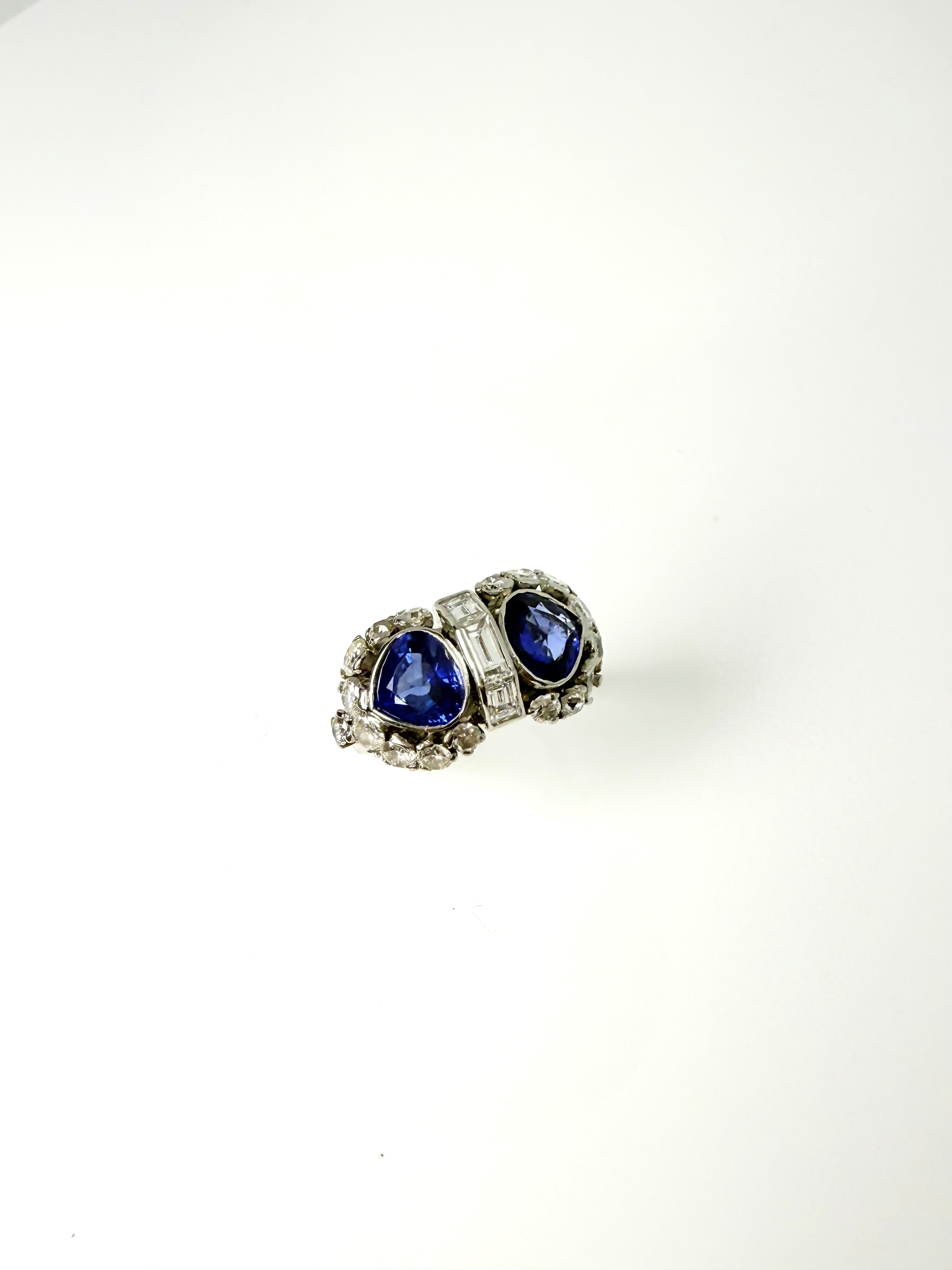 TWO STUNNING HEART SHAPE SAPPHIRES IN A RUB-OVER SETTING WITH A CLUSTER OF DIAMONDS SURROUNDING THEM.